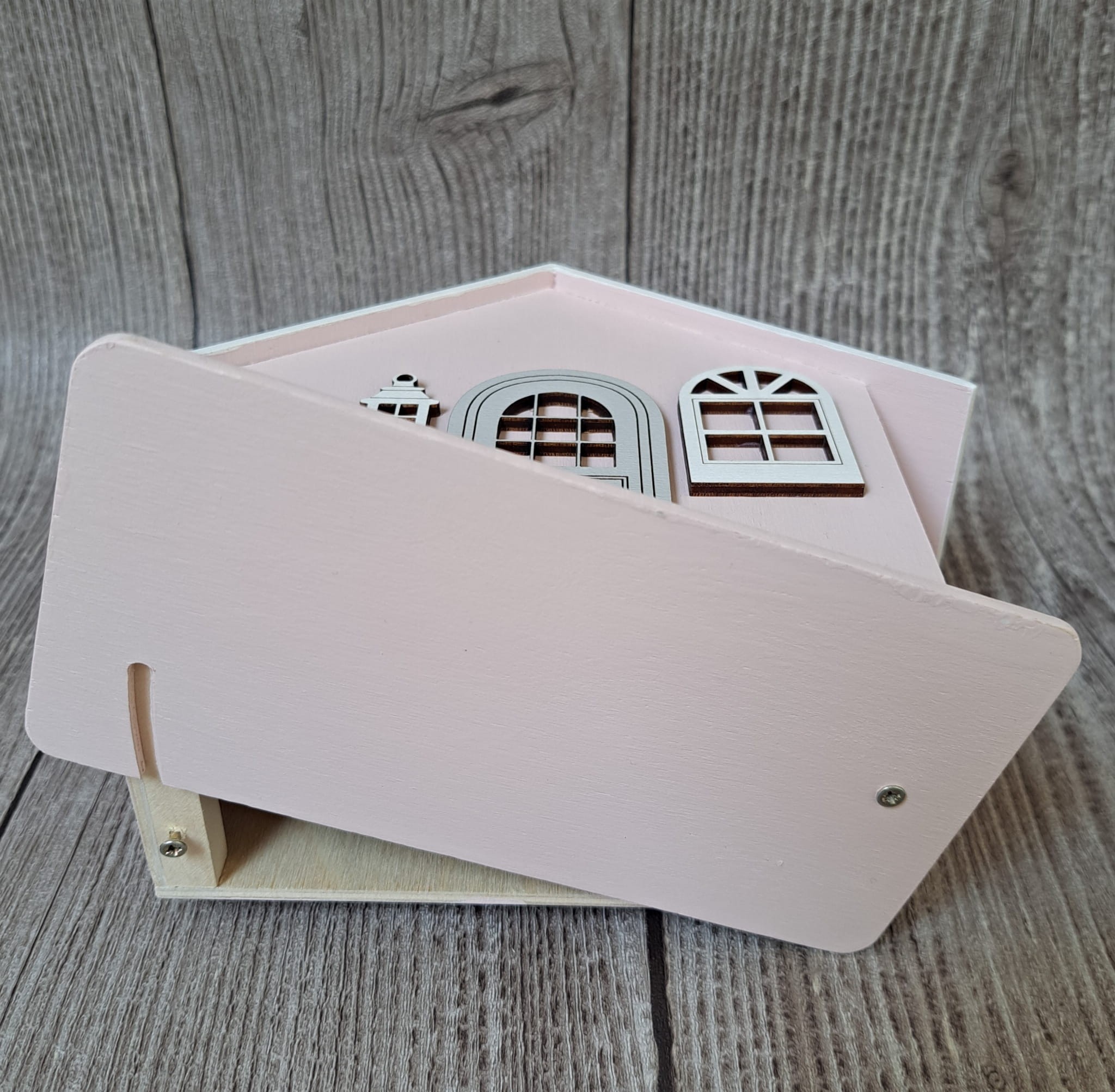 Prezentowana skarbonka jest w kolorze pudrowego różu a jej dach pomalowany został na biały kolor.