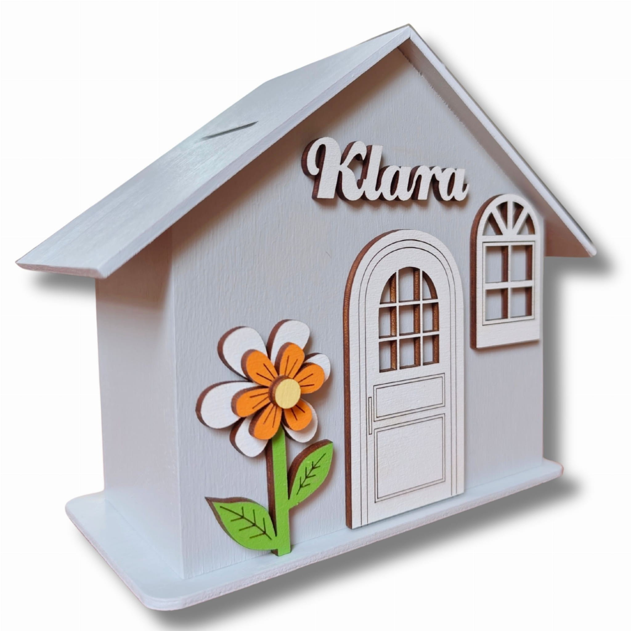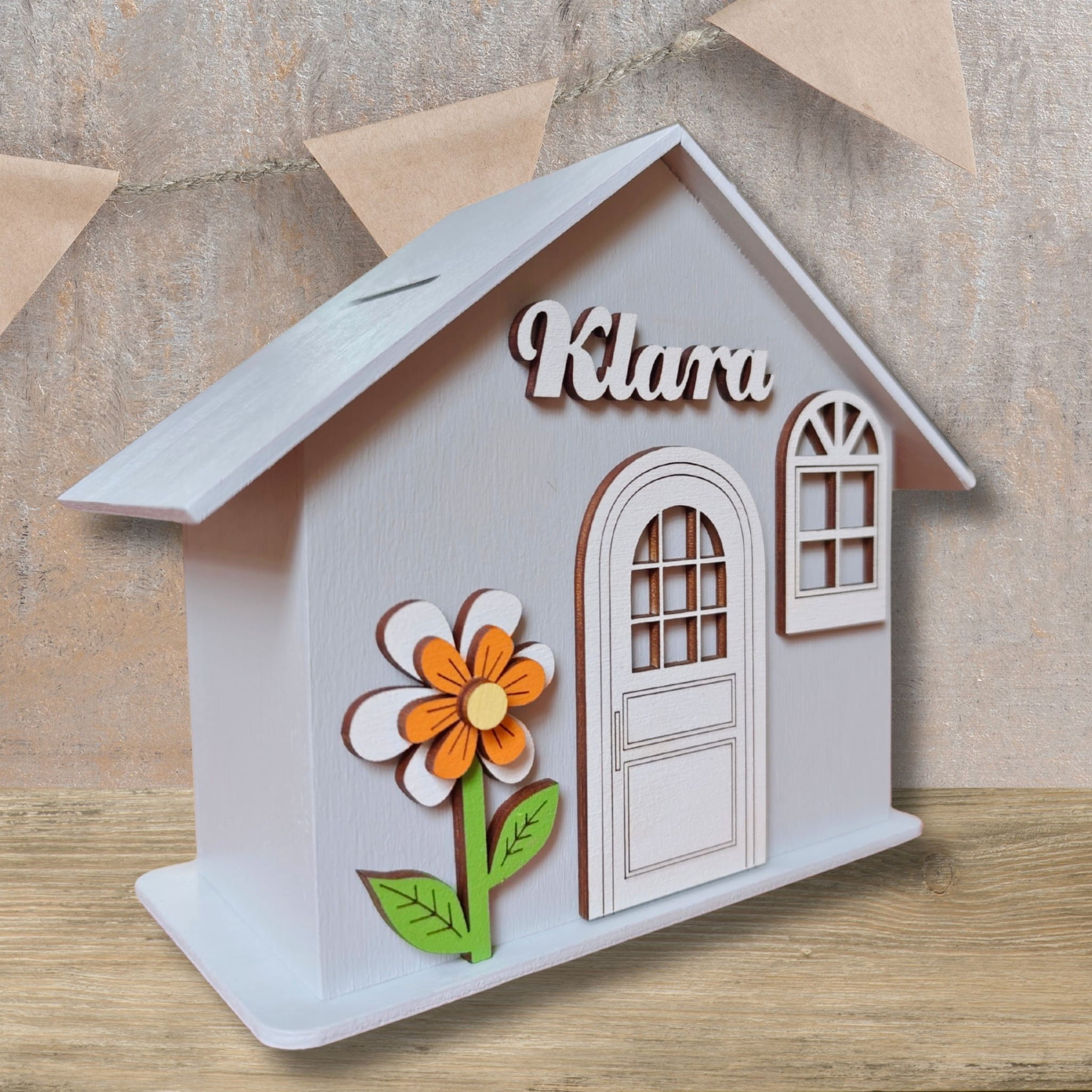 Z przodu skarbonki znajduje się okienko, drewniane drzwi oraz ręcznie malowany przez naszych plastyków dekor.