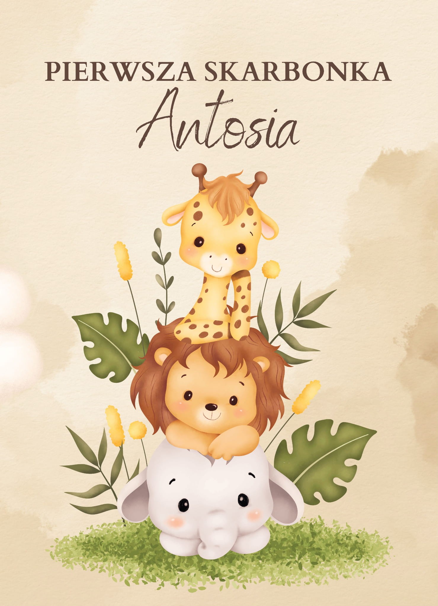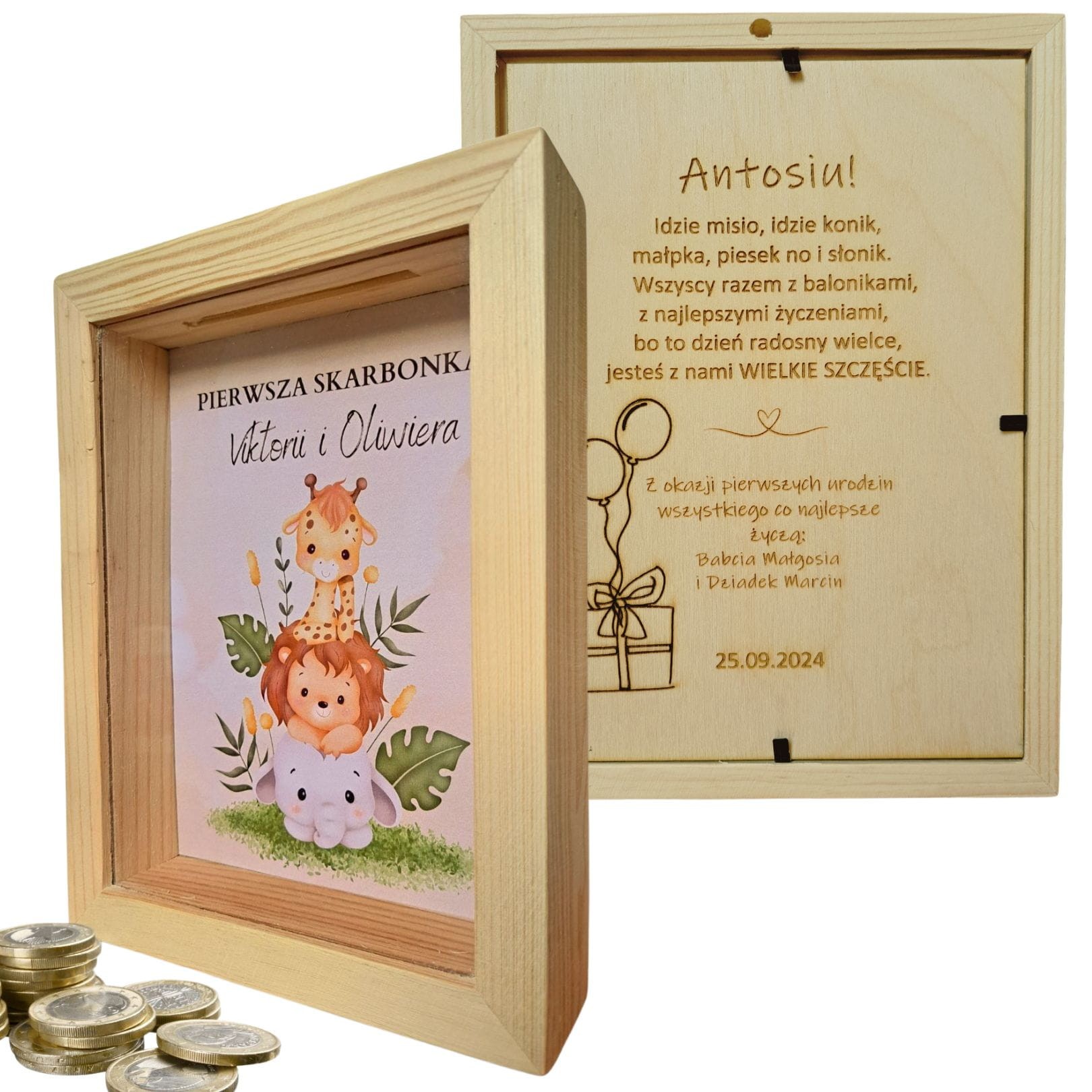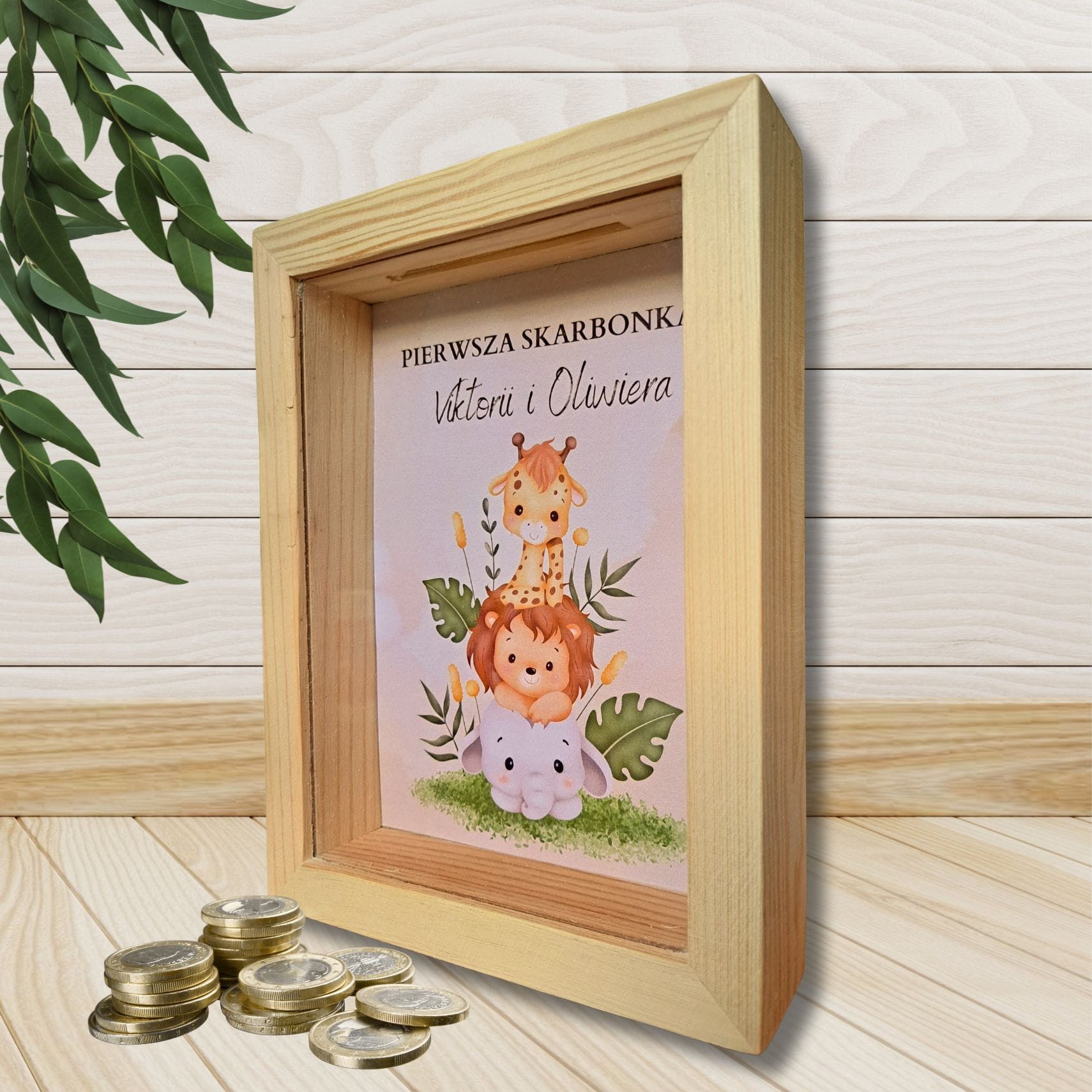 Prezentowana skarbonka z szybką wykonana została z drewna a jej tylnia ściana ozdobiona została nadrukiem z imieniem dziecka. Przód skarbonki wykonany został z przeźroczystej szyby.